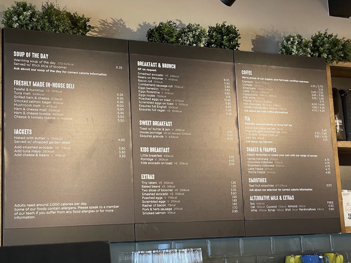 Esquires Coffee Ruislip offers a delightful and diverse menu perfect for any time of the day, whether you're craving a hearty breakfast, a light snack, or a refreshing beverage. The Breakfast & Brunch section includes tasty options like the Smashed Avocado and Beans On Bloomer, perfect for those looking for a healthy start. The Bacon Roll and Cumberland Sausage Roll cater to those in the mood for something a bit more indulgent. If you're in the mood for a classic breakfast, try the Eggs Benedict, which is sure to satisfy.